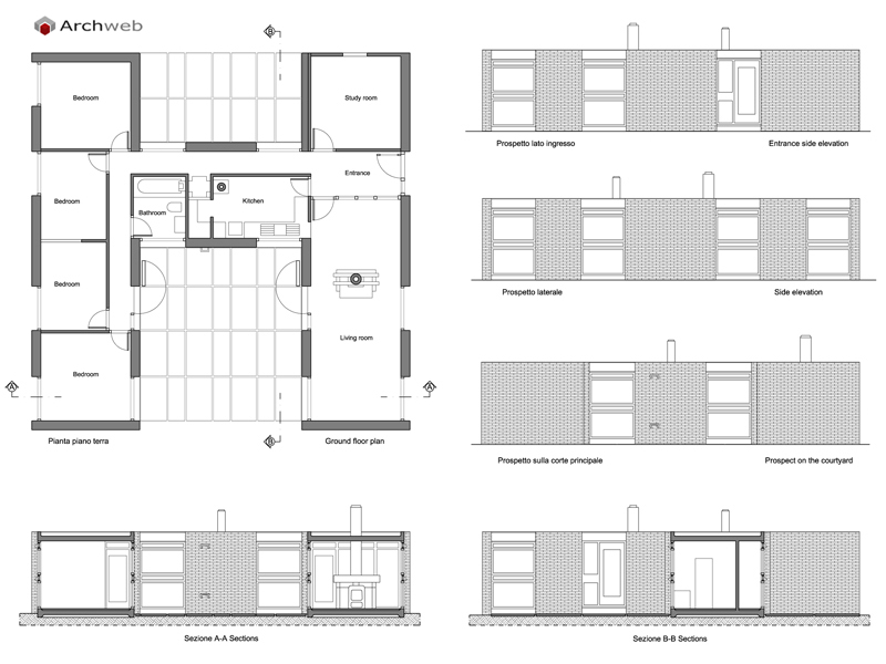 Il progetto in pianta ha la forma della lettera H, per cui si formano due cortili che si aprono verso il giardino anteriore e posteriore. I materiali esterni sono molto semplici, mattoni a vista e legno naturale per le finestre a tutta altezza. Le finestre sono praticamente modulari, si ripetono quindi lungo i prospetti interrompendo la continuità della superfice in mattoni.