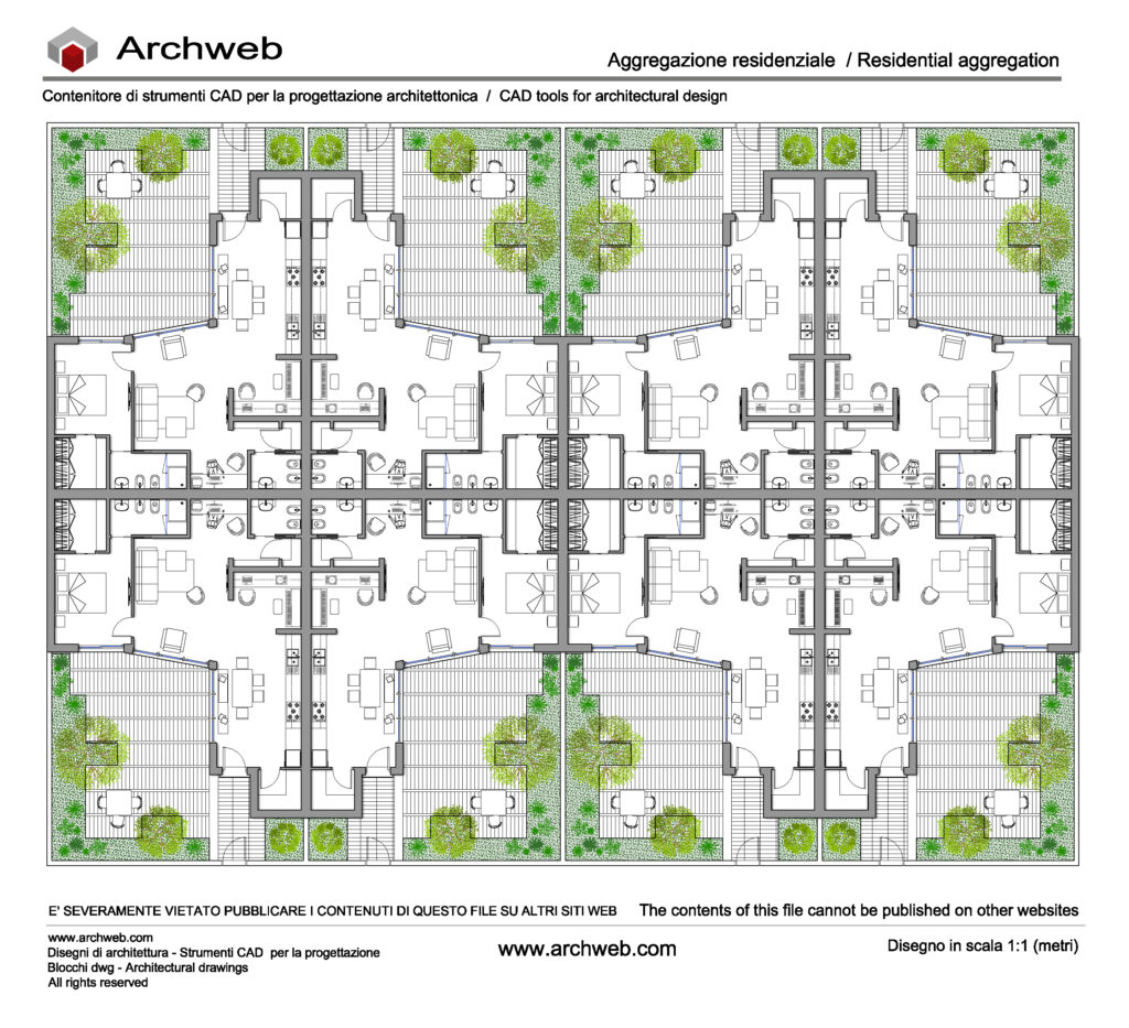 L’aggregazione evidenzia un sistema residenziale orizzontale, pensato per insediamenti a bassa densità, in cui la ripetizione delle unità consente efficienza progettuale e costruttiva, mantenendo al tempo stesso una buona articolazione degli spazi verdi e delle aree di affaccio.