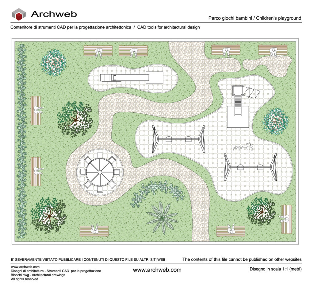 Schema progettuale di un parco pubblico dal design armonioso che combina natura, aree di relax e un’area dedicata ai giochi per i bambini.