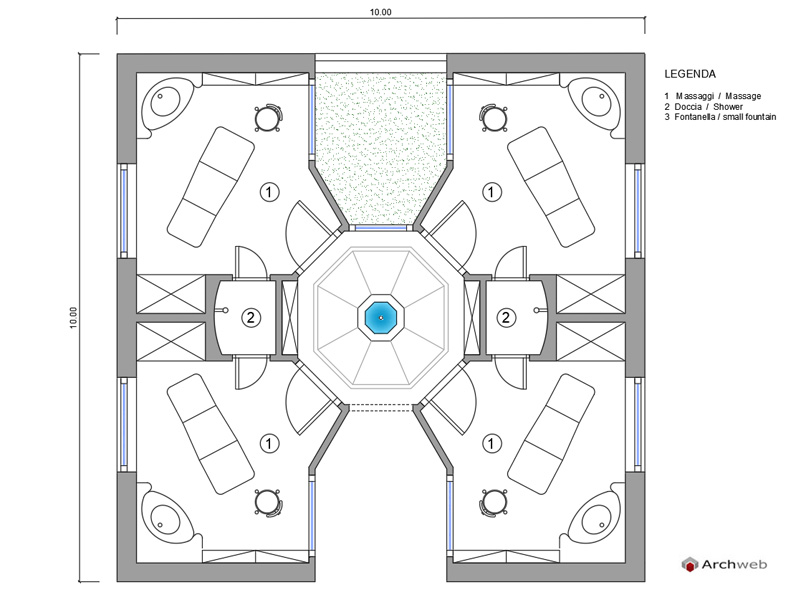 Schema progettuale che comprende quattro sale massaggi con doccia. L’ingresso ottagonale alle quattro salette ha una fontanella al centro e prende luce da un piccolo patio. Dimensioni massime metri 10 x 10