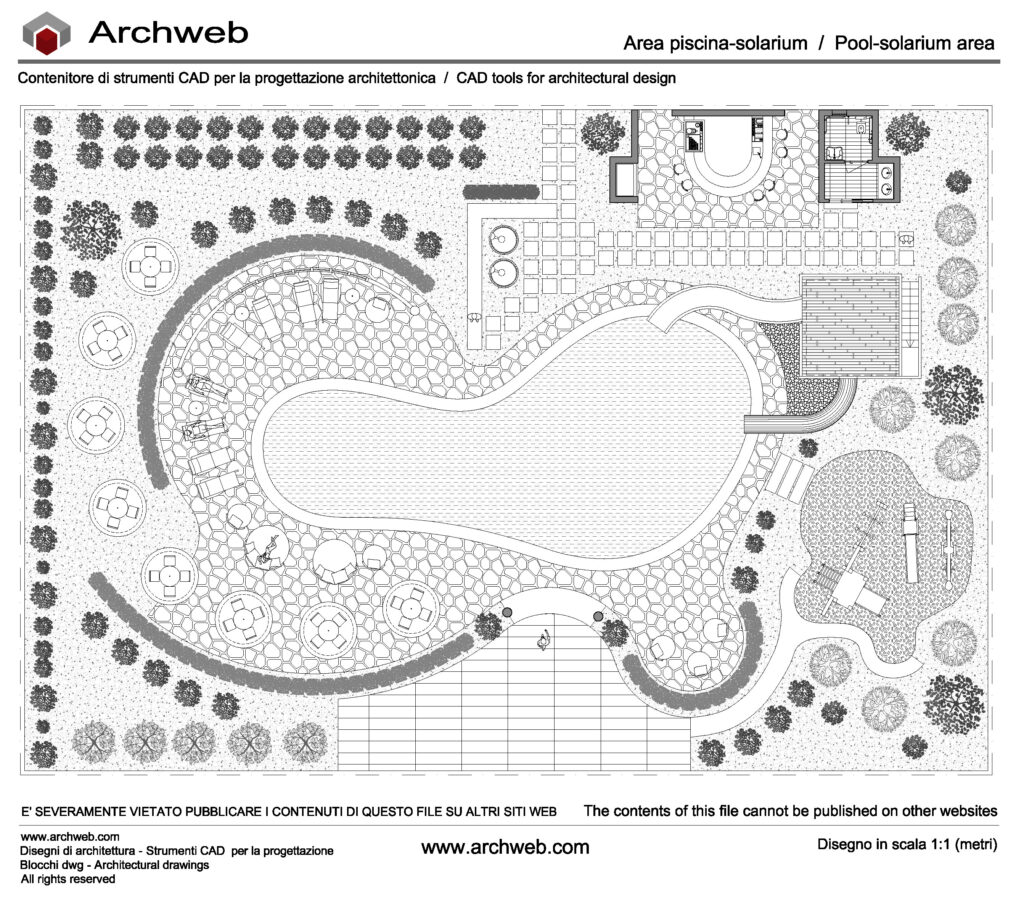 Schema progettuale per un’area piscina–solarium, elaborata come spazio outdoor attrezzato per alberghi, resort, villaggi turistici e strutture ricettive in genere.