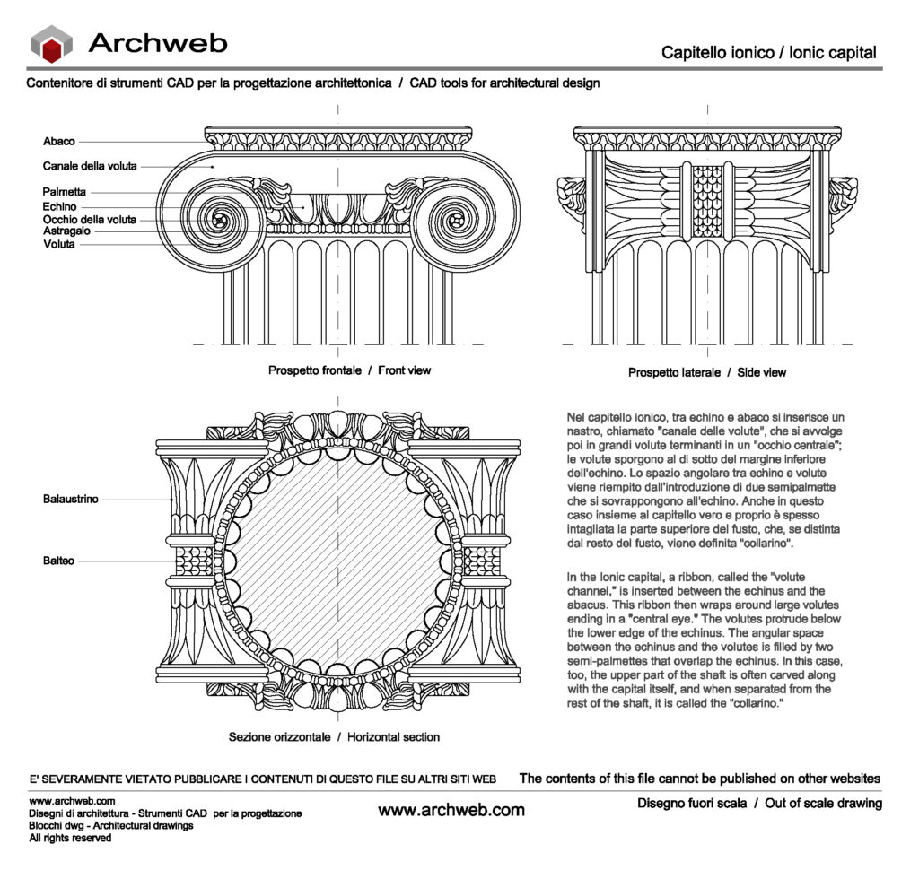 Il capitello ionico è uno degli elementi più riconoscibili dell’ordine ionico e si distingue per una struttura articolata e per una ricca tradizione decorativa. A differenza del capitello dorico, il capitello ionico presenta una forte direzionalità visiva, dovuta alla diversa configurazione dei suoi lati.