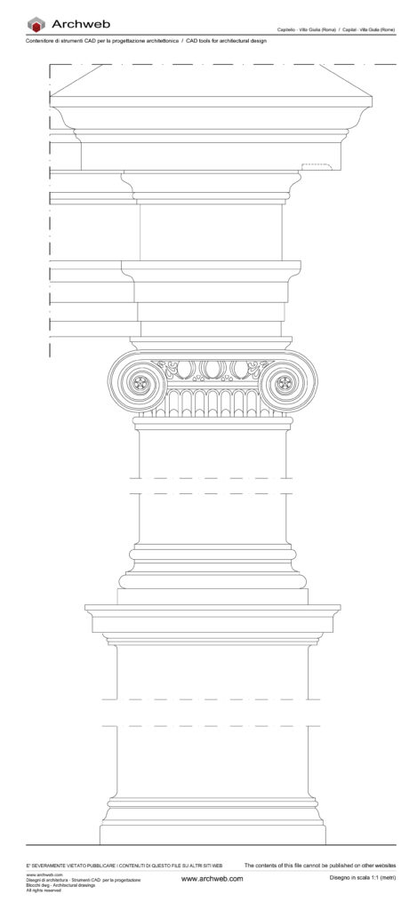 Il capitello rappresentato appartiene all’ordine ionico, ma si distingue per una elaborazione decorativa raffinata, tipica dell’architettura rinascimentale romana, in particolare del complesso di Villa Giulia (XVI secolo).