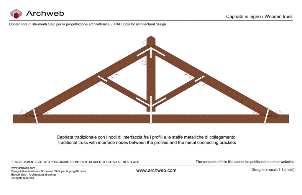 Disegno di una capriata tradizionale in legno, realizzata con nodi di interfaccia fra i profili lignei e staffe metalliche di collegamento. La rappresentazione mostra in maniera chiara gli elementi costruttivi principali: catena, puntoni, monaco e saettoni, uniti mediante staffe metalliche con bullonature.