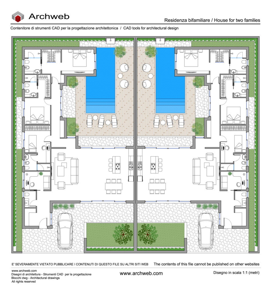 Nel complesso, la pianta propone un modello abitativo contemporaneo. La chiarezza distributiva e l’attenzione agli spazi esterni rendono la residenza bifamiliare adatta a nuclei familiari distinti.