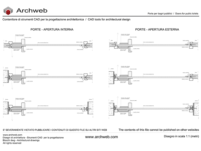 In questa categoria sono presenti file dwg utili alla progettazione di bagni per abitazioni e per il pubblico: bagni – servizi igienici, bagni per persone disabili, progetti di bagni, blocchi sanitari, cabine doccia, vasche a parete, vasche ad angolo, minipiscine, mobili per il bagno, piatti doccia, rubinetterie, sauna e bagno turco, bagni chimici, spogliatoi per centri sportivi.