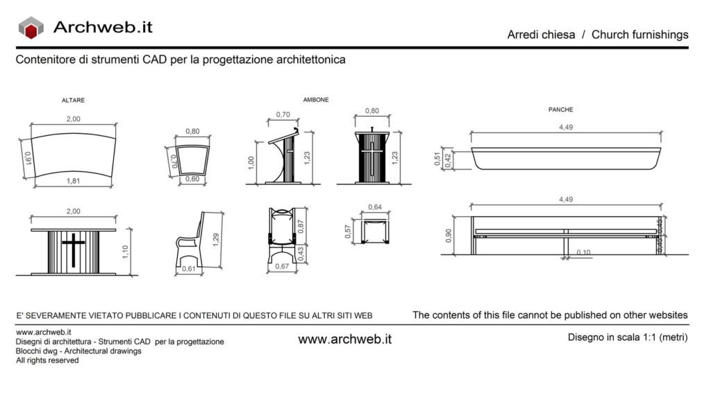 Pianta e prospetto delle varie parti che compongono il presbiterio di una chiesa: altare, ambone, tabernacolo, sede.