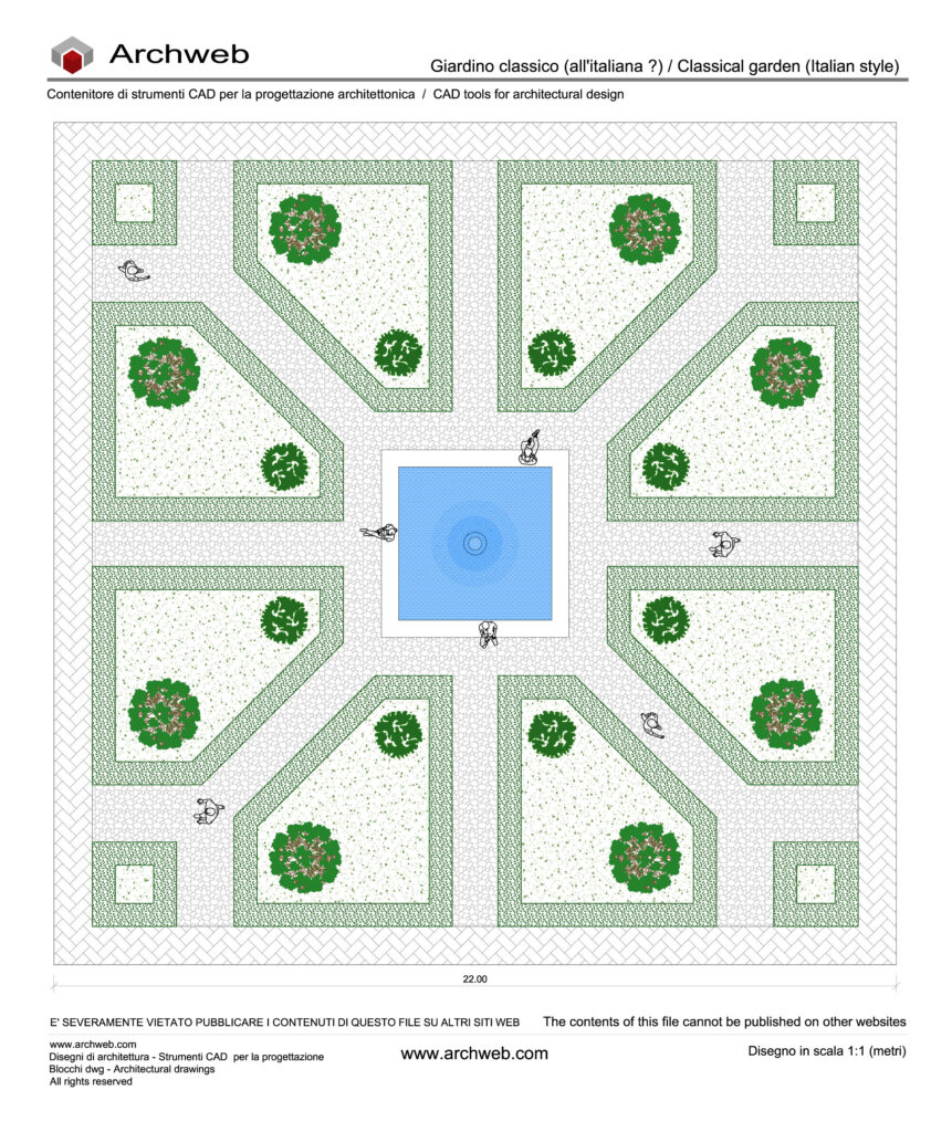Nel complesso, il disegno restituisce un esempio chiaro e didattico di giardino all’italiana, caratterizzato da simmetria, proporzione, ripetizione degli elementi e netta separazione tra spazi verdi e spazi di percorrenza, ideale come riferimento per progetti di spazi esterni formali o storicizzati.