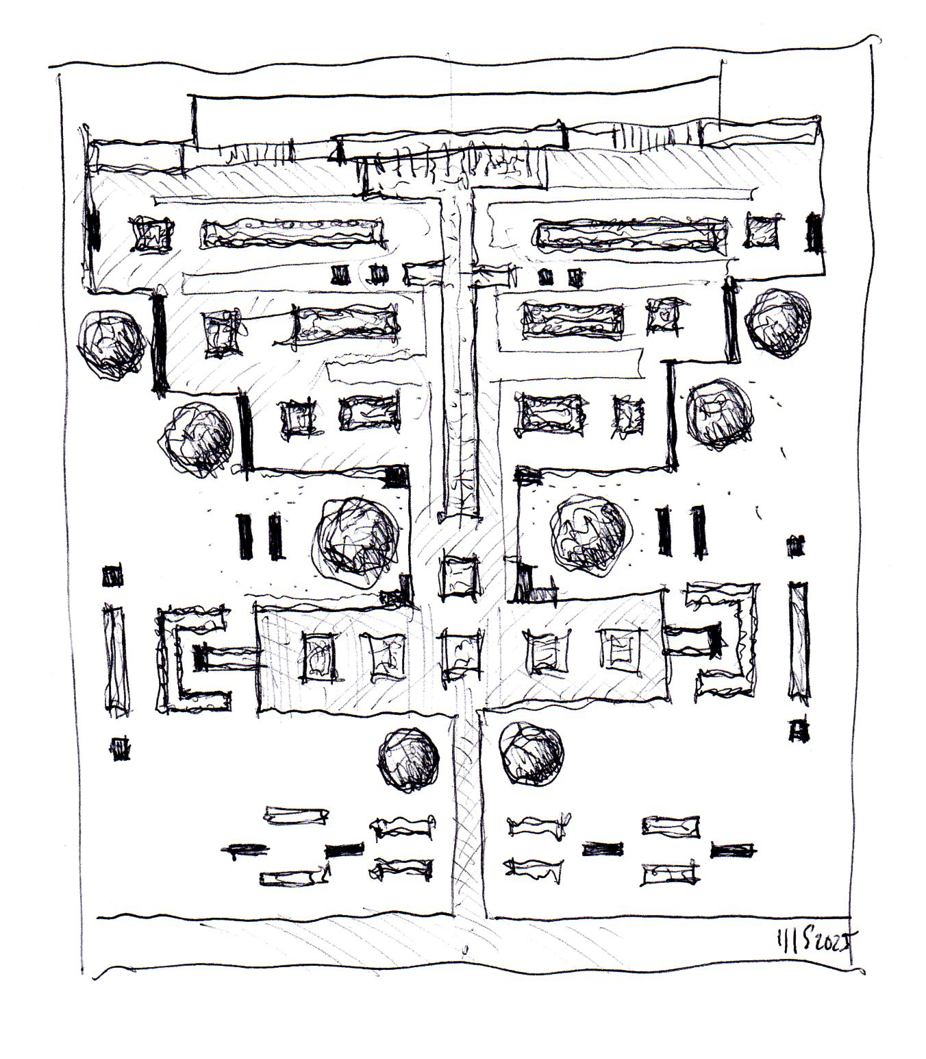 Un disegno che vuole dimostrare come i principi storici del giardino all’italiana possano ancora oggi offrire spunti progettuali attuali, se reinterpretati con misura e chiarezza compositiva.