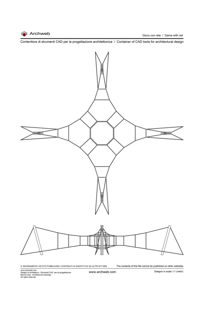 Nel disegno è presente pianta ed una prospettiva di un gioco con le reti per bambini. Tubolari d’acciaio incastrati saldamente nel terreno, posti nei quattro lati opposti tengono in tensione un sistema di reti che servono ai bambini per arrampicarsi ed oscillare al loro interno, divertendoli e stuzzicandoli a giocare. Nella parte centrale la maglia di reti si fa più fitta e complessa così che i bambini possano viverla come una sfida stimolando il loro intuito, le loro capacità motorie, la capacità di socializzare dovuta al sistema che permette a più bambini di giocare insieme. La soluzione risulta anche flessibile perché spostando il modulo dei pilastrini d’acciaio si possono progettare altre trame. Ideale per parchi pubblici per bambini, e anche per adulti che vogliono praticare un po’ di sport.