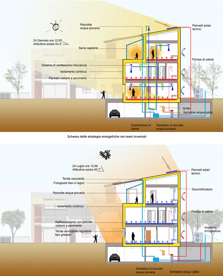 "La corte del futuro" Un complesso residenziale energeticamente efficiente di 7 unità abitative a Torre Boldone (BG). Progetto dello studio: Atelier2 – Gallotti e Imperadori Associati. Le immagini dei due bellissimi schemi delle strategie energetiche nei mesi invernali ed estivi