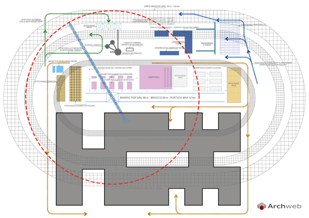 La planimetria rappresenta l’organizzazione di un cantiere edile. Tutti i materiali da costruzione vengono collocati in posizioni strategiche per una maggiore fluidità delle lavorazioni e in rapporto al raggio e alla portata della gru.