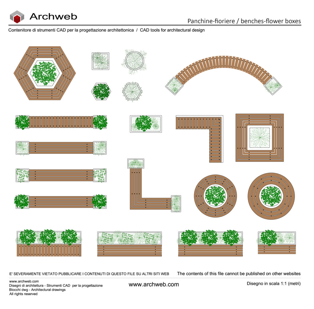 Grazie alla varietà di tipologie rappresentate, questo disegno costituisce un pratico repertorio di elementi CAD per l’arredo urbano, facilmente inseribile nei progetti di sistemazione paesaggistica e negli elaborati planimetrici di parchi, giardini e spazi pubblici.