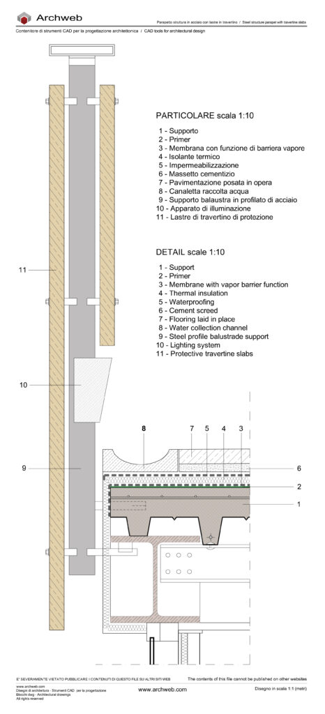 Dettaglio costruttivo di un parapetto con supporto balaustra in profilato di acciaio e lastre di travertino di protezione.