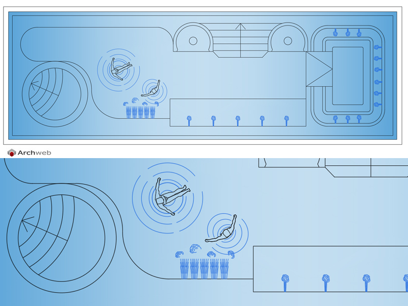 Piscina per un centro benessere con aree differenziate per trattamento, area con idrogetti a pressione per specifice parti del corpo. Dimensioni: metri 20.50 x 7.10