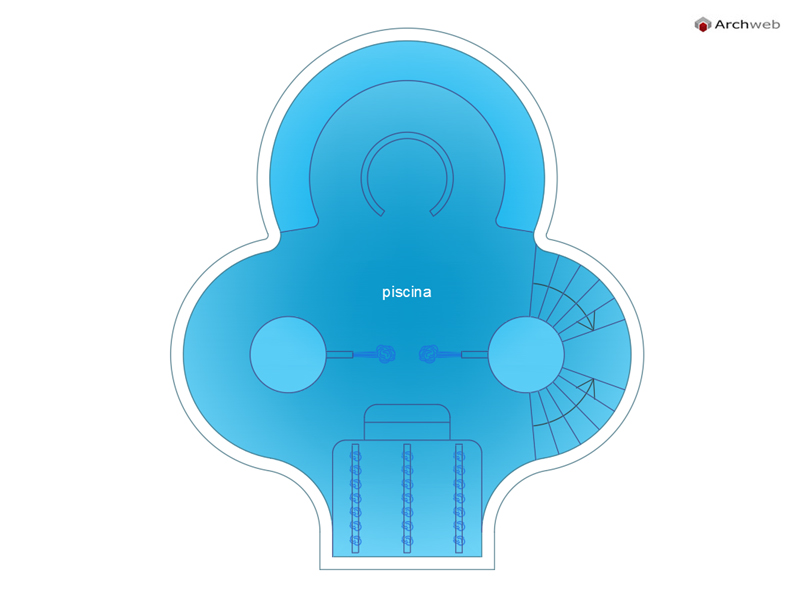 Piscina per centro benesse con forma trilobata e scale di discesa facilitata, area con seduta e barra di appoggio per la camminata fisioterapica, passaggio tra due idrogetti, area idrogetti multipli.