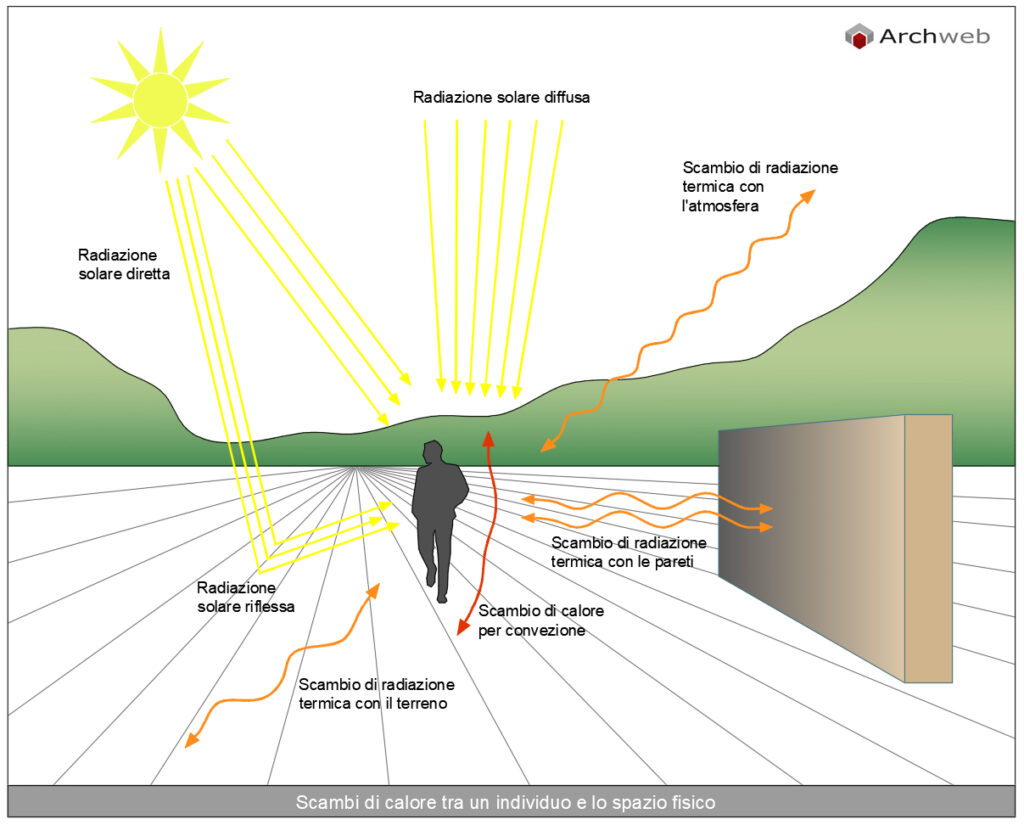 Scambi di calore nell’ambiente e tra un individuo e lo spazio fisico – Schema rappresentativo degli scambi di calore