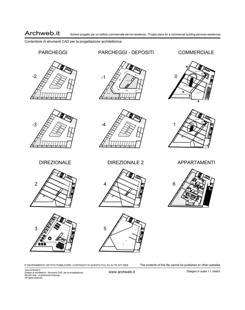 Edificio multipiano con quattro livelli di parking interrato, piano terra e tre piani superiori di spazi commerciali, piano uffici e direzione, ultimo piano residenziale con 3 appartamenti.