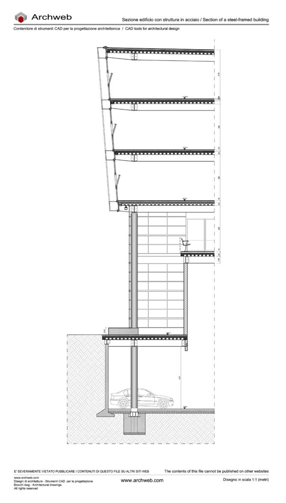 Sezione verticale di un edificio multipiano con struttura portante in acciaio, sviluppata con un livello di dettaglio tale da evidenziare chiaramente sia gli aspetti strutturali sia quelli costruttivi.