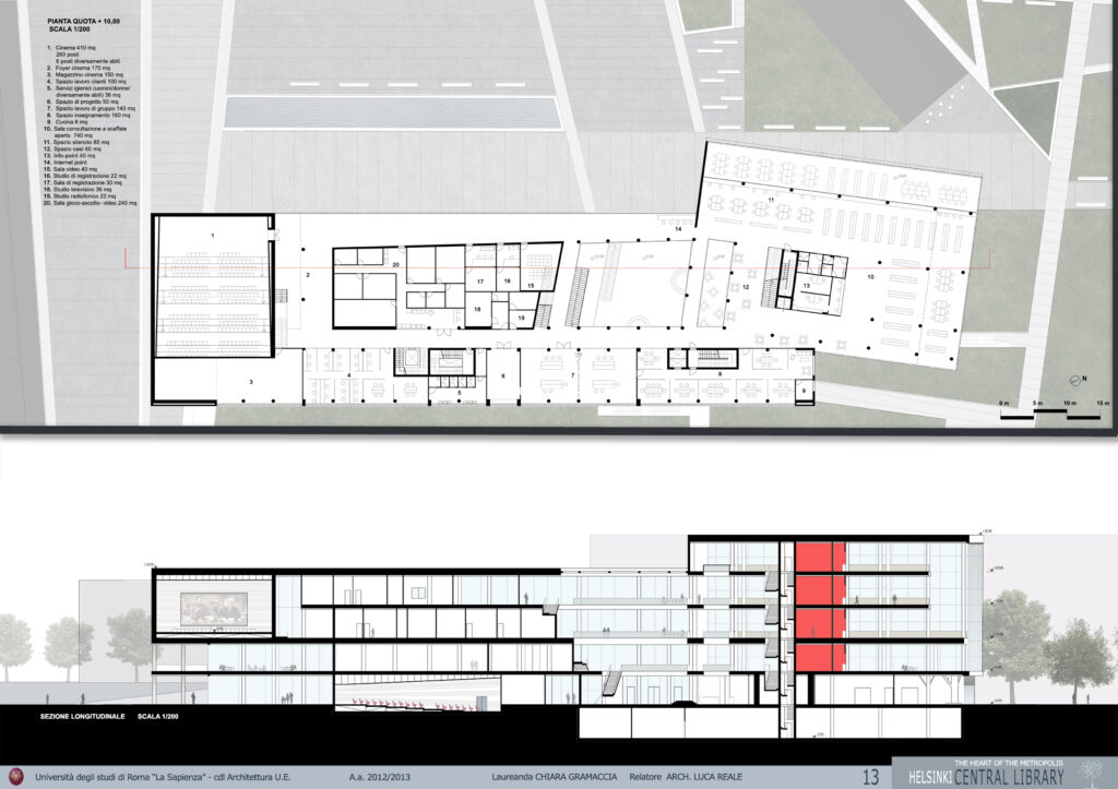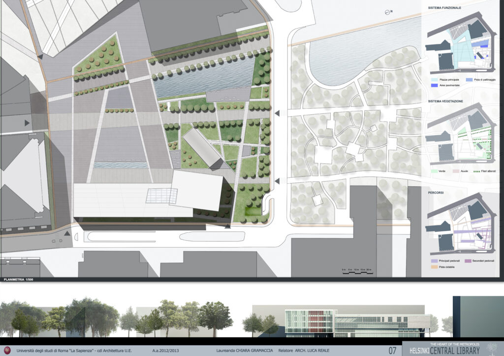 La Biblioteca Centrale andrà a integrare il tessuto urbano della zona di Töölönlahti e ne definirà lo spazio pubblico urbano centrale. Il progetto, infatti, comprende anche la sistemazione della piazza, e ha l’obiettivo di colmare il vuoto urbano e al contempo valorizzarlo sotto l’aspetto ubanistico-architettonico, creando una cucitura, in termini di paesaggio urbano, tra l’esistente e il nuovo, tra la città e la natura.