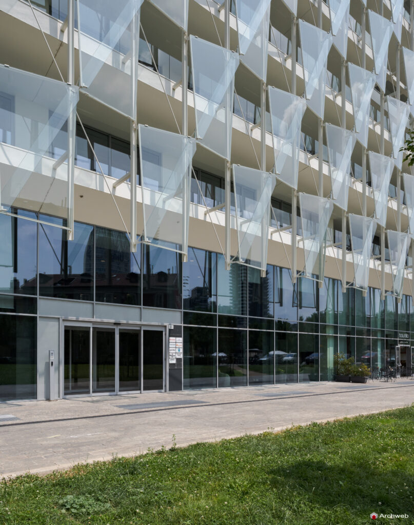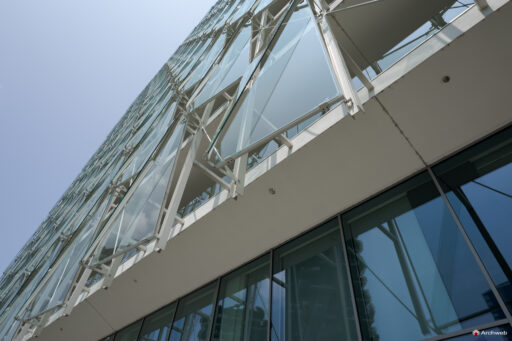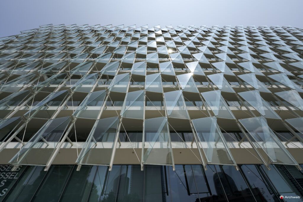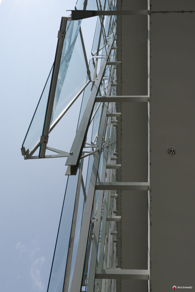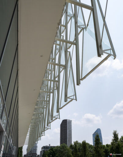 La facciata, caratterizzata da un disegno di vele triangolari in vetro e acciaio, muta riflessi e intensità luminosa nel corso della giornata, restituendo un’immagine sempre diversa. Questo involucro non è solo un gesto estetico, ma una vera e propria pelle intelligente, pensata per garantire comfort visivo e ridurre l’irraggiamento diretto negli ambienti di lavoro.