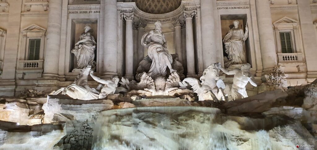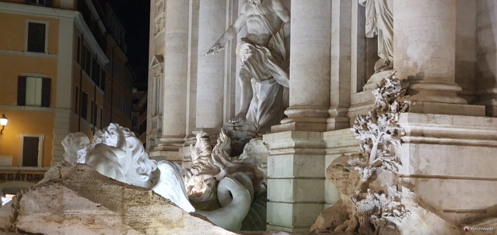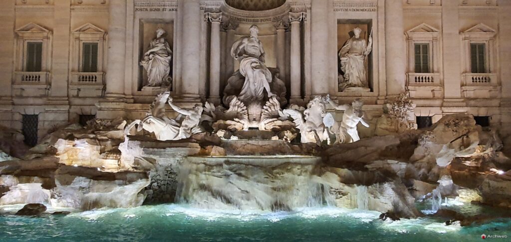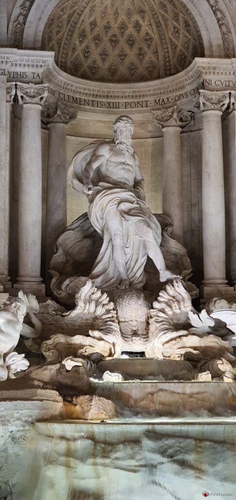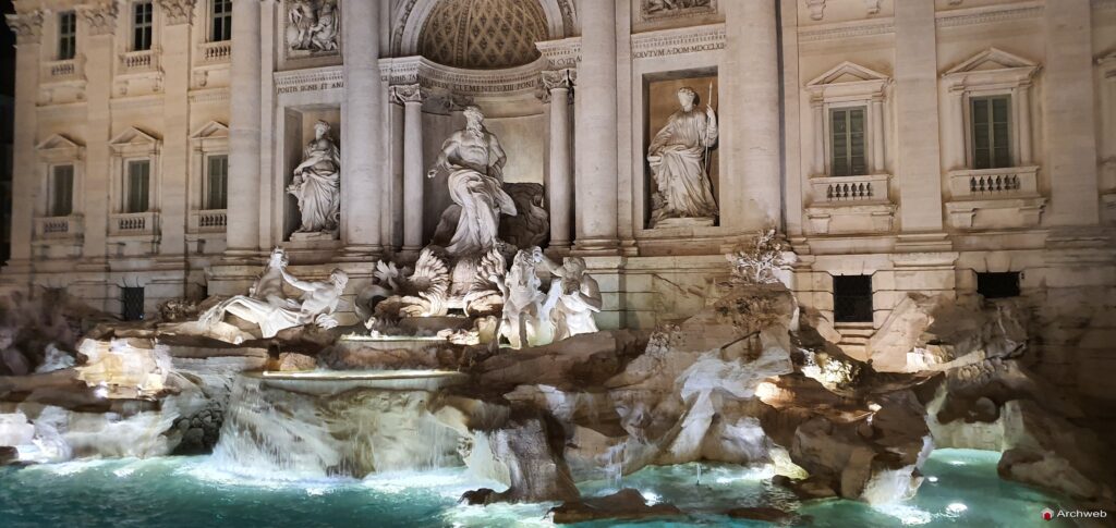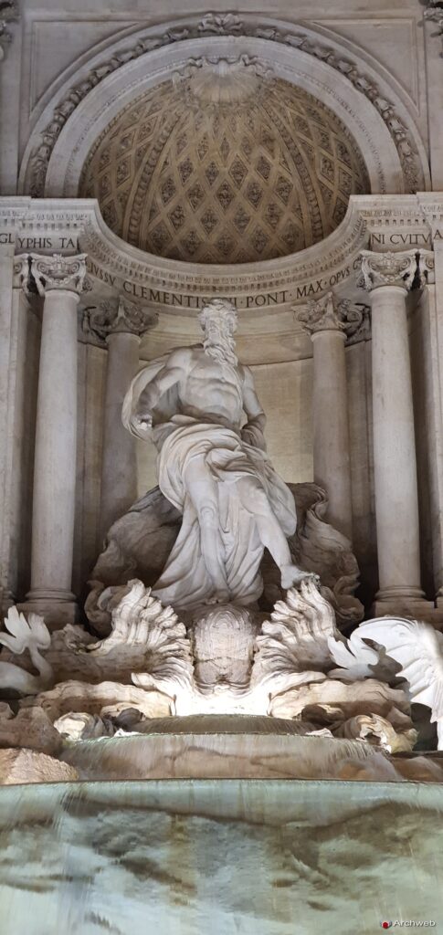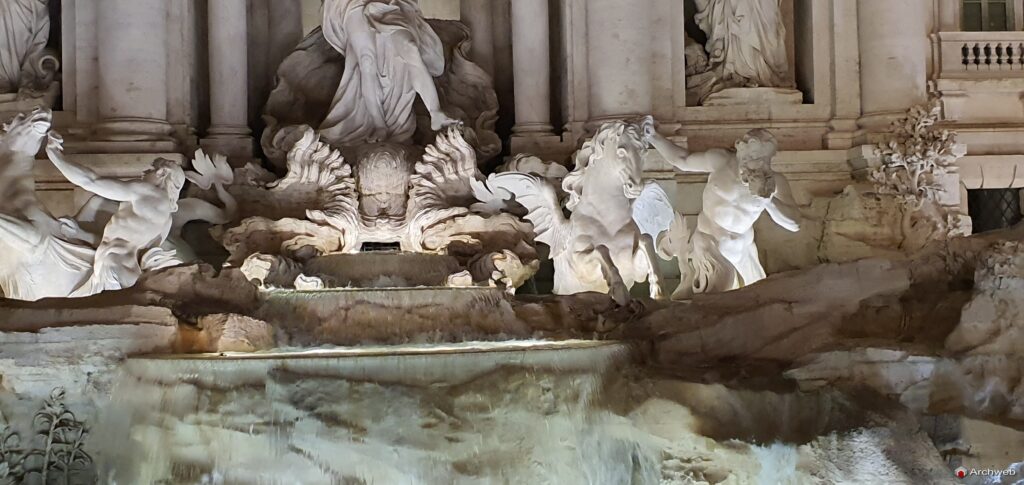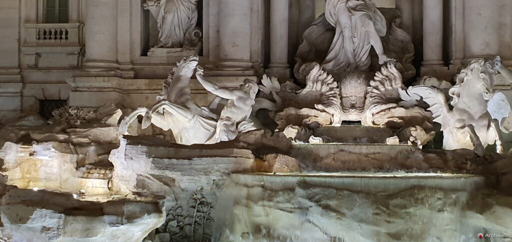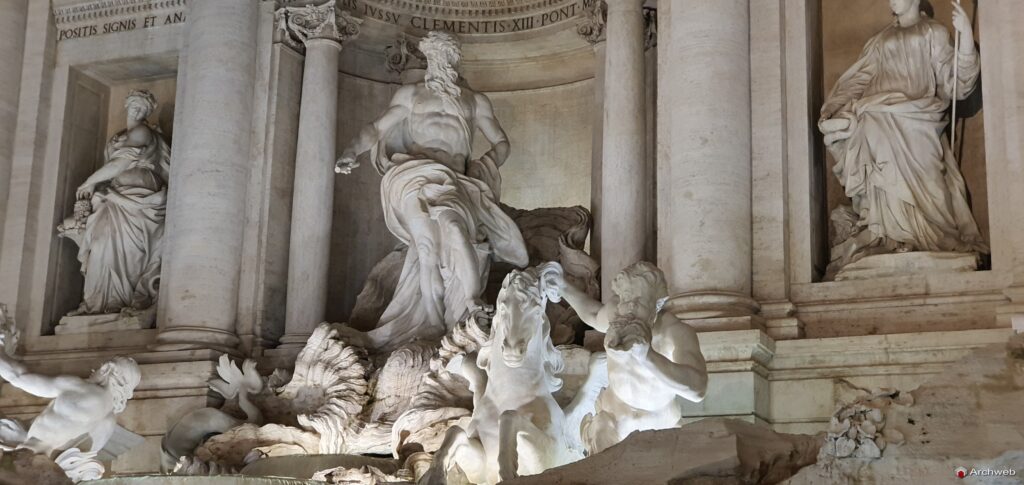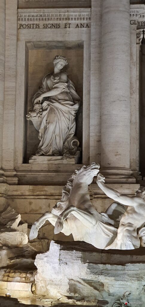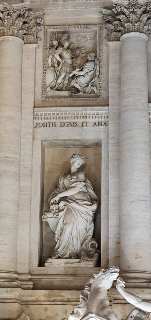 Nelle nicchie di destra e di sinistra si trovano la Fertilitas e la Salubritas, mentre ad una successiva esecuzione appartiene la statua centrale dell’Oceano su un cocchio tirato da cavalli marini realizzata nel 1762 da Pietro Bracci; sull’attico infine compaiono le raffigurazioni delle quattro stagioni.
