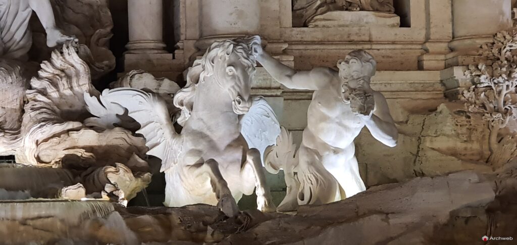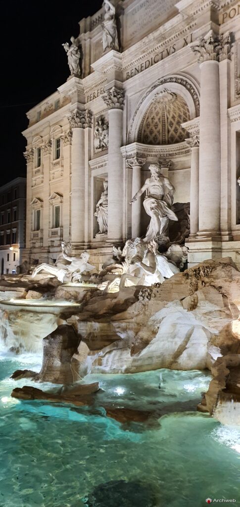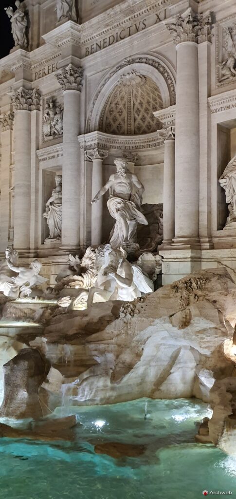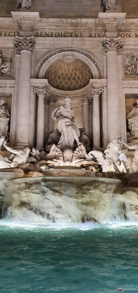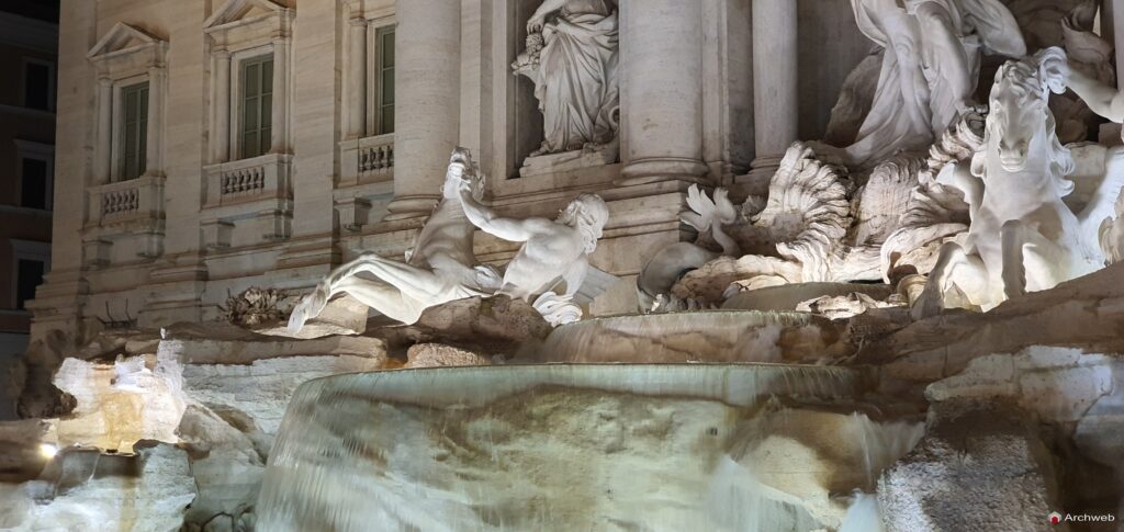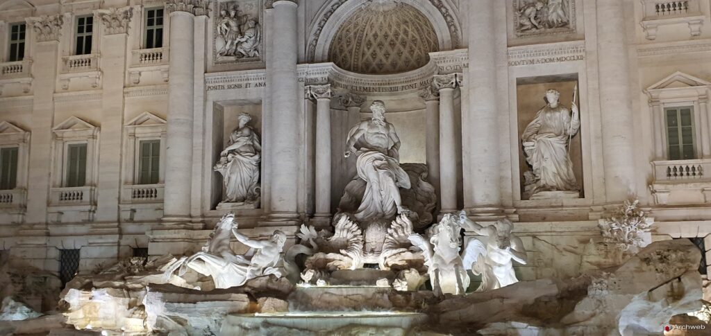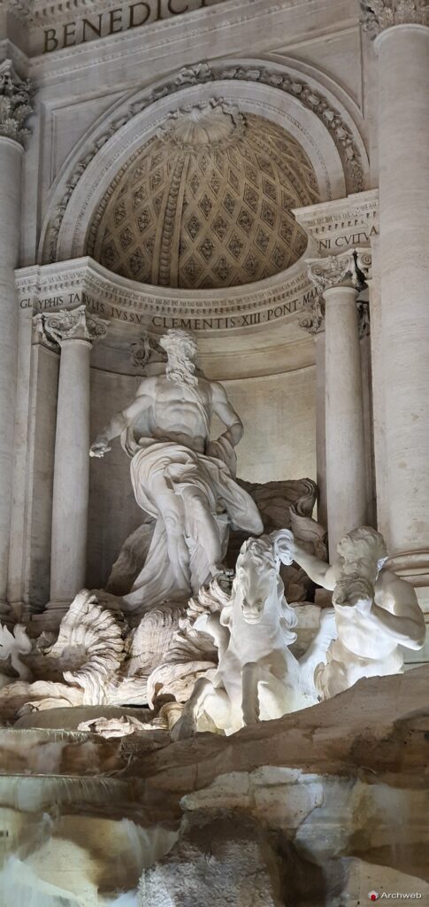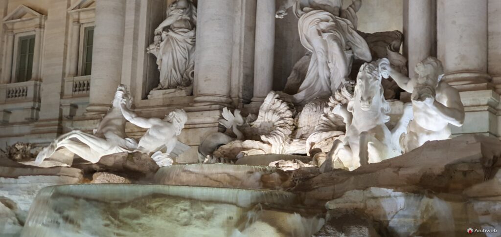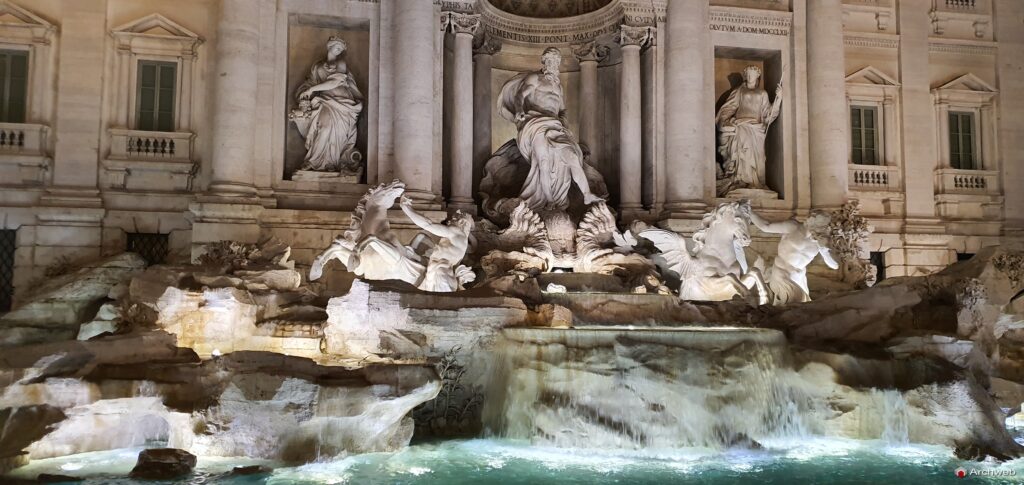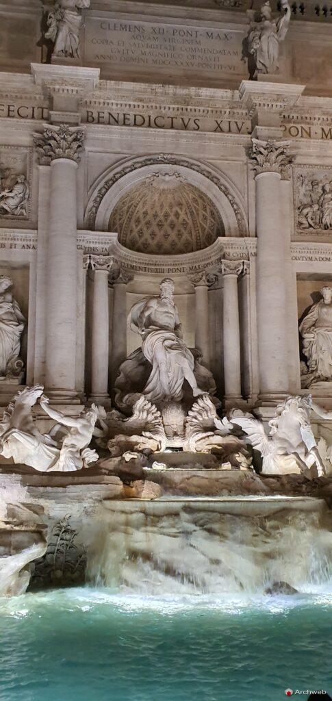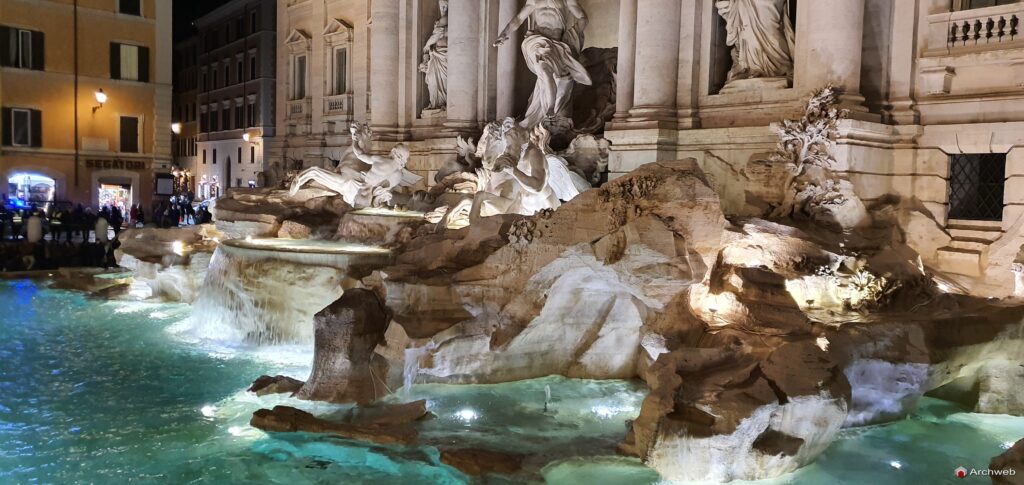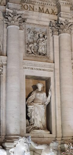 Nelle nicchie di destra e di sinistra si trovano la Fertilitas e la Salubritas, mentre ad una successiva esecuzione appartiene la statua centrale dell’Oceano su un cocchio tirato da cavalli marini realizzata nel 1762 da Pietro Bracci; sull’attico infine compaiono le raffigurazioni delle quattro stagioni.