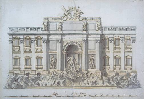 Per il concorso del ‘32 si ha notizia di altri tre disegni del Salvi, noti dalle descrizioni del Milizia e dello stesso architetto: quello qui riprodotto, che rappresenta già il progetto definitivo, non è un disegno di presentazione, bensì un foglio di lavoro utilizzato probabilmente dal Salvi per definire lo sviluppo degli elementi scultorei del complesso.
