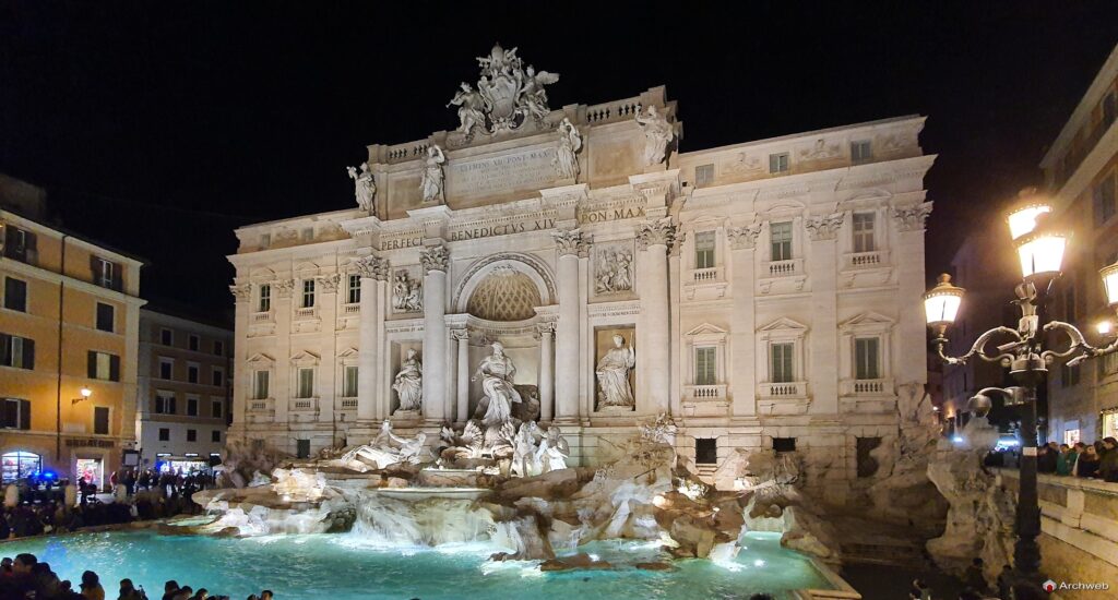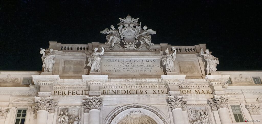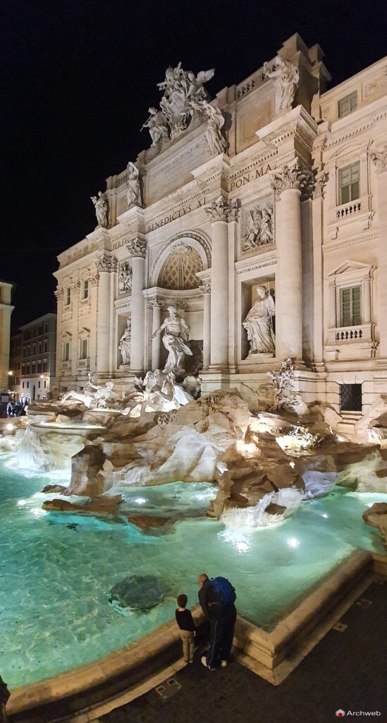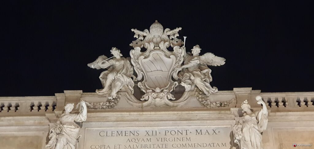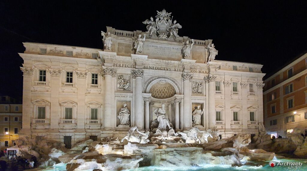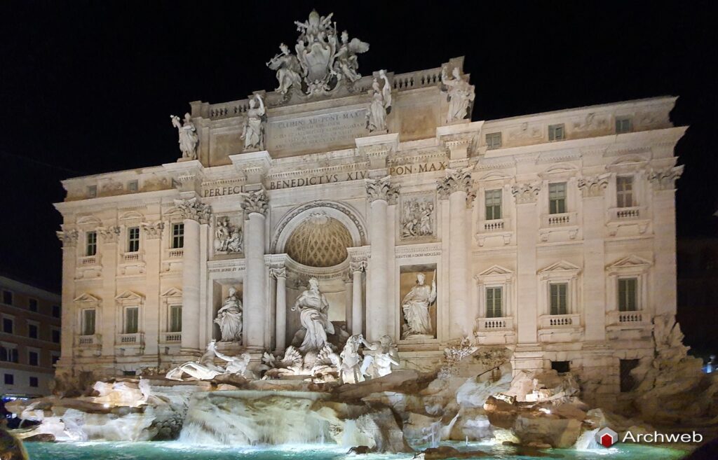 Costruita sulla facciata di Palazzo Poli da Nicola Salvi, il concorso indetto da papa Clemente XII nel 1731 era stato inizialmente vinto dallo scultore francese Lambert-Sigisbert Adam ma successivamente l'incarico passò a Salvi: si dice che il cambiamento fosse dovuto al fatto che il pontefice non voleva affidare l'opera a uno straniero; invece, un'altra versione, spiega che Adam doveva ritornare in Francia
