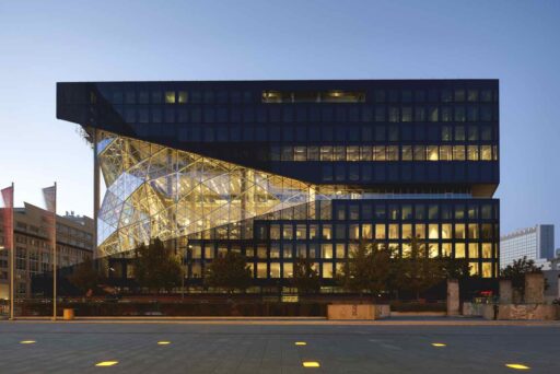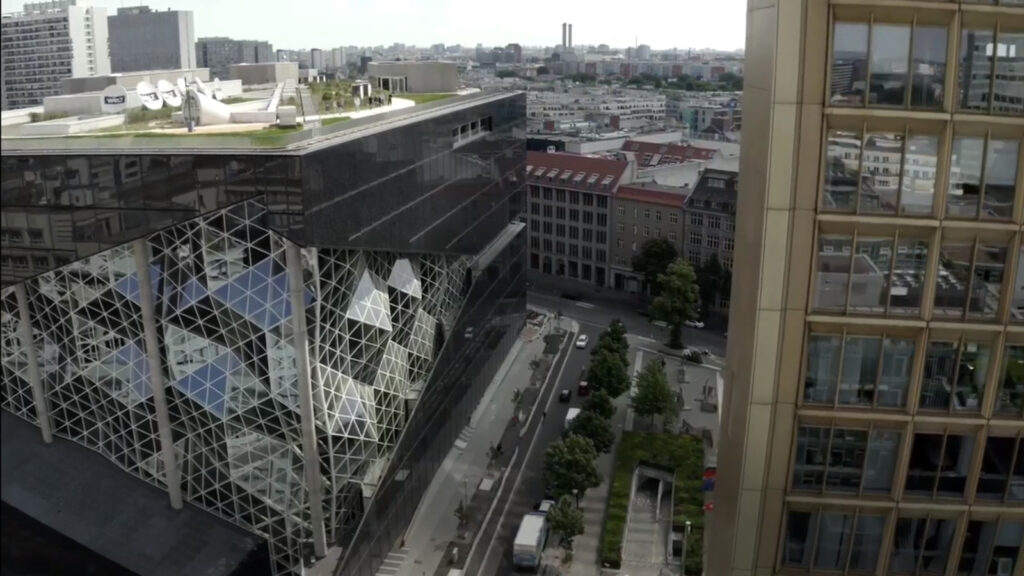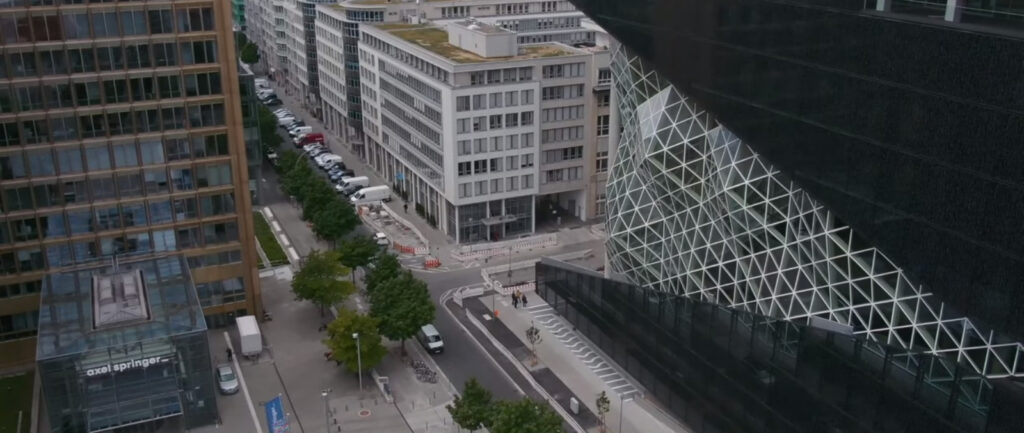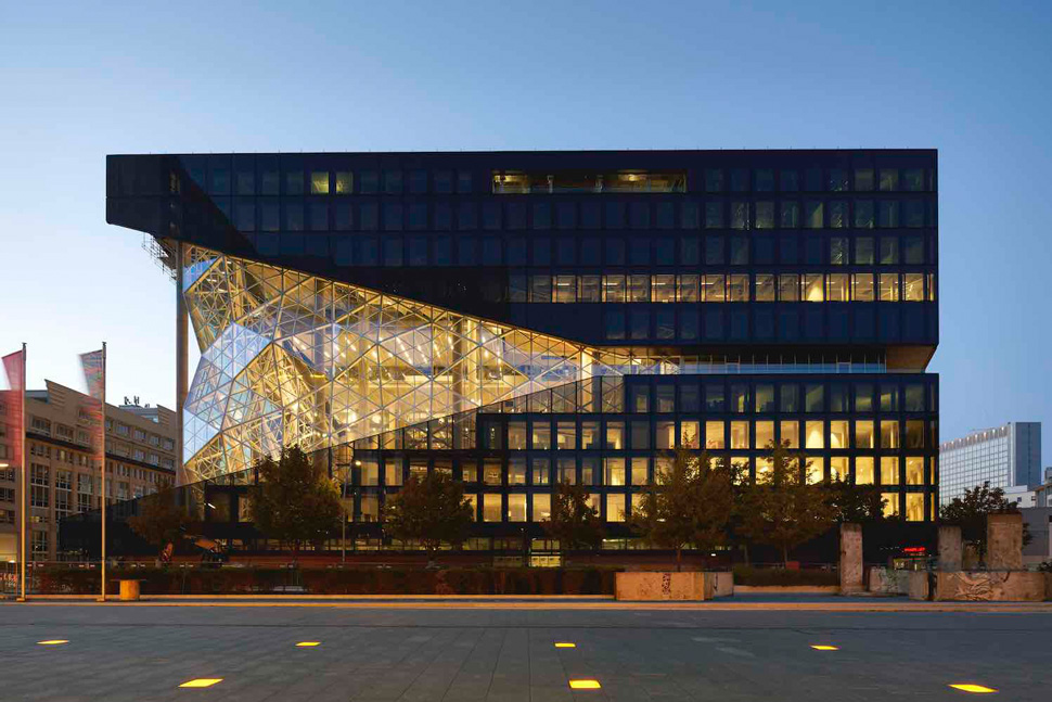 Il nuovo edificio Axel Springer offre 52.000 metri quadrati di spazio di lavoro per oltre 3.000 dipendenti e si caratterizza per la sua architettura aperta e trasparente. A cavallo dell'ex confine, l'atrio inondato di luce alto 45 metri divide l'edificio in sezioni in un incontro perpetuo tra loro attraverso lo spazio. Nello spazio intermedio, le dieci storie terrazzate e i 13 ponti creano connessioni tra le sezioni e forniscono ispirazione per incontri fisici nell'era digitale.