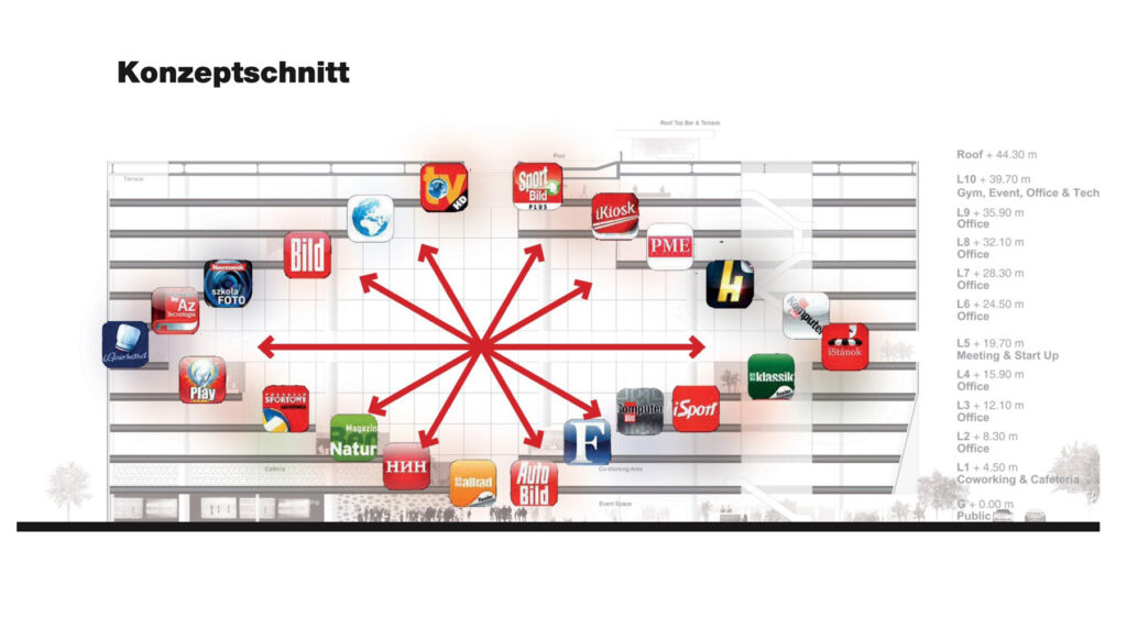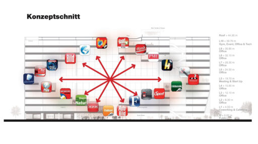 OMA ha vinto il concorso per il nuovo edificio di Axel Springer nel 2014. Il brief chiedeva un nuovo spazio per ospitare le divisioni aziendali in crescita di Axel Springer e le offerte digitali, riflettendo nel contempo un ambiente di lavoro moderno.