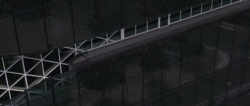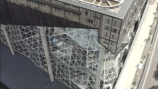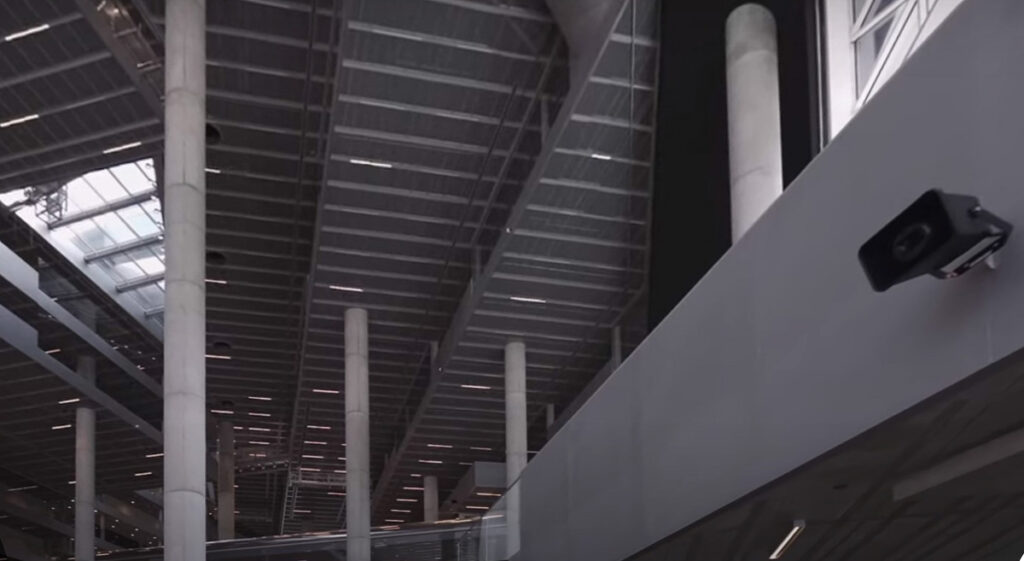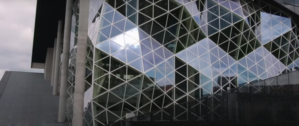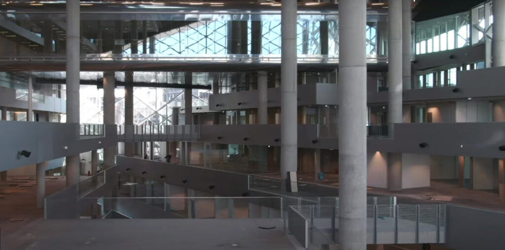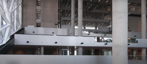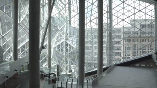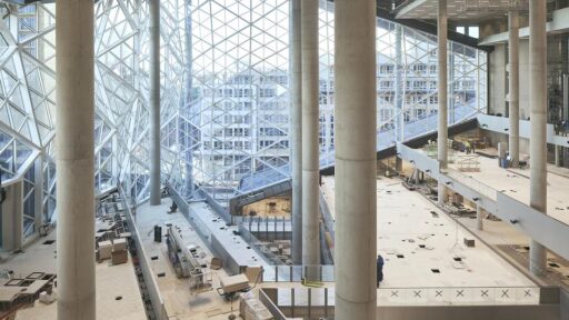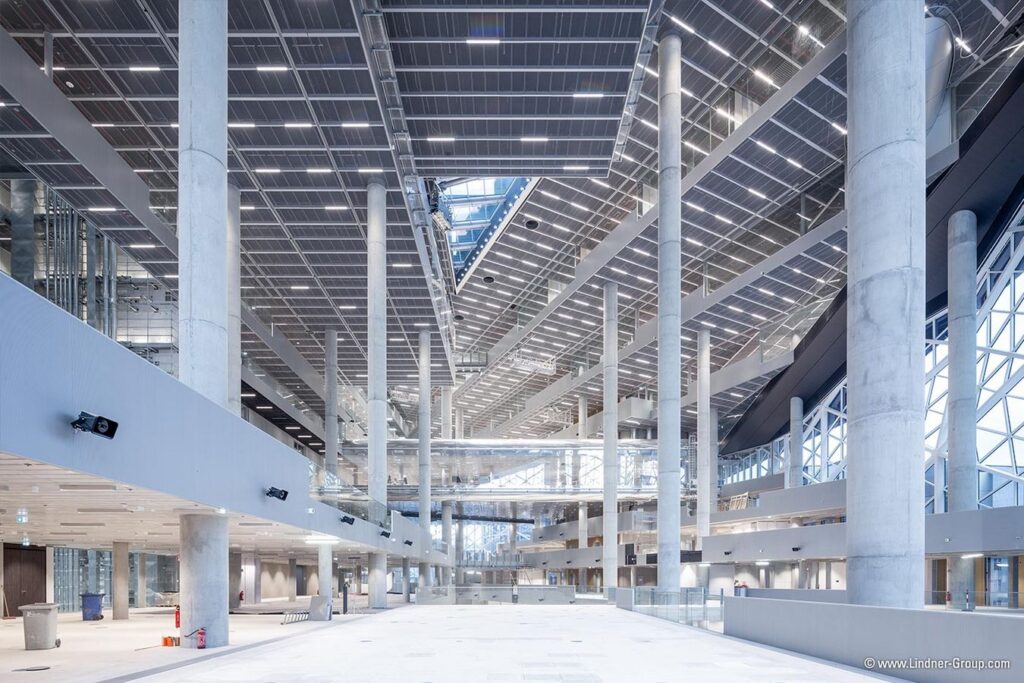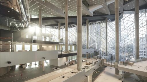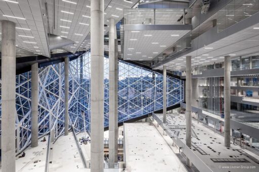 Un grande guscio a griglia sul lato dell'edificio con pannelli di vetro geometrici ad angolo consente alla luce naturale di inondare l'atrio. All'interno, la connettività visiva è rafforzata da un ponte di incontro collaborativo, che collega i due lati dell'atrio con una piattaforma panoramica aperta al pubblico che offre uno sguardo sul funzionamento quotidiano dell'azienda. (Arup)