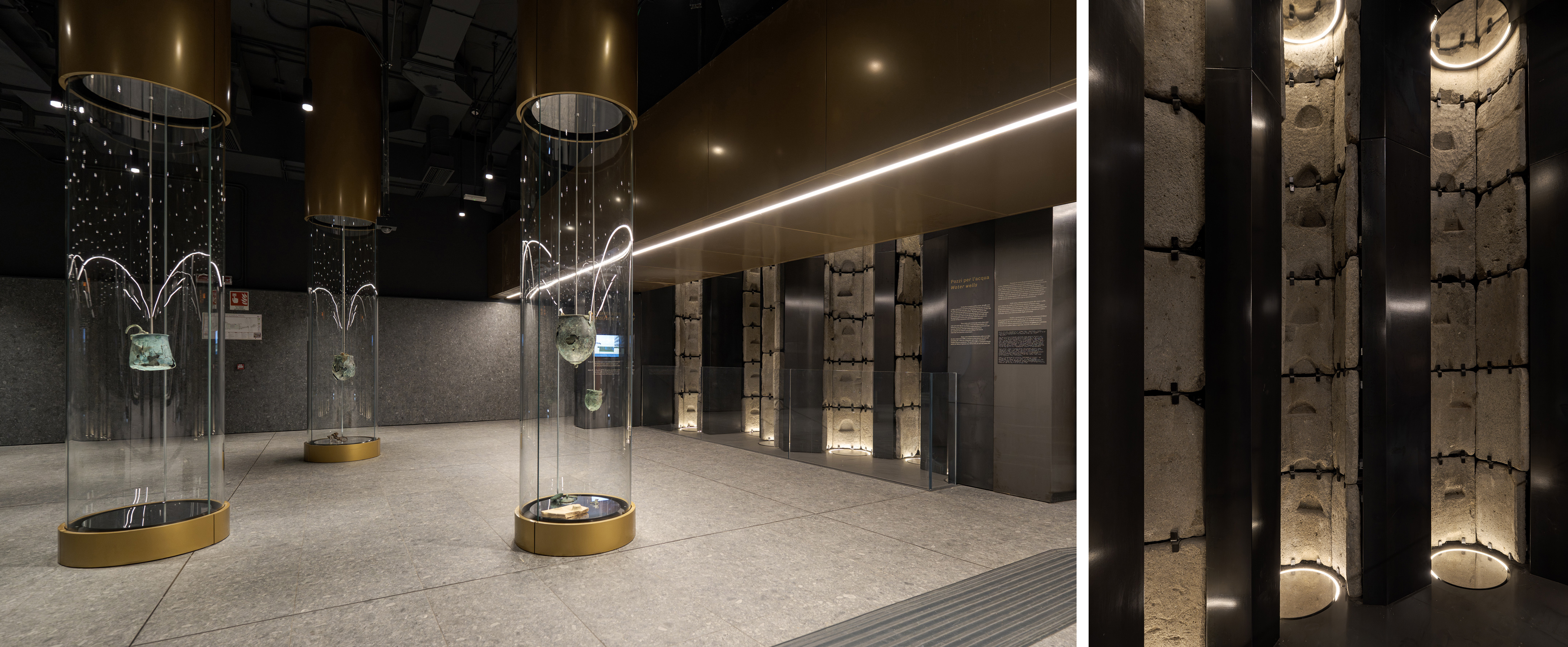 La verticalità dei pozzi dialoga con quella della stazione stessa, uno spazio che accompagna il visitatore in una discesa progressiva nel sottosuolo. Antico e contemporaneo si incontrano così su un terreno comune: quello della costruzione e della gravità.